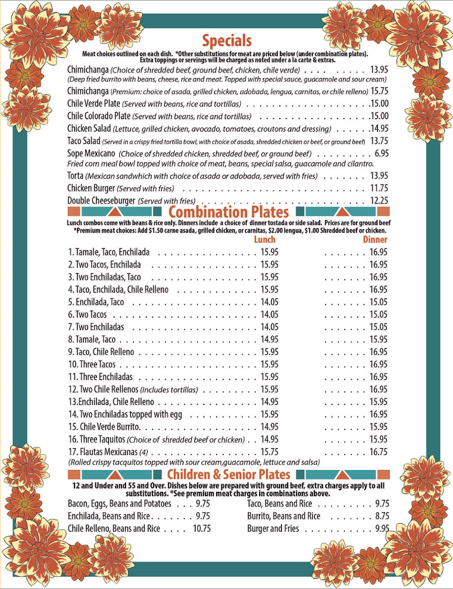 But the goodness doesn't stop there. The Chile Verde Plate served with beans, rice, and tortillas for US$15.00 showcases flavors that are rich and comforting, while the Combination Plates offer a fantastic variety including tamales, tacos, and enchiladas for lunch or dinner. Plus, there's a selection tailored especially for children and seniors, ensuring everyone can find something delightful.
